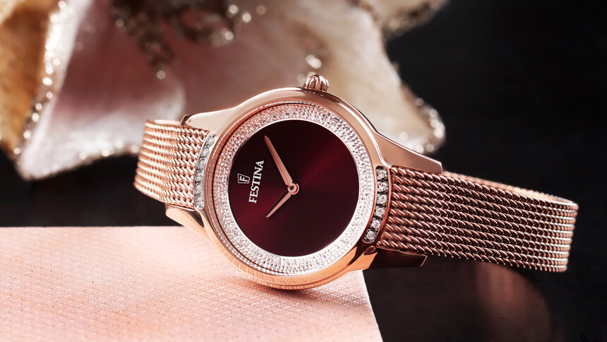 Die zierliche Festina Mademoiselle mit rotem Zifferblatt und feinem Milanaise-Armband zählt seit ihrer Einführung zu den Dauerbrennern an vielen Handgelenken.