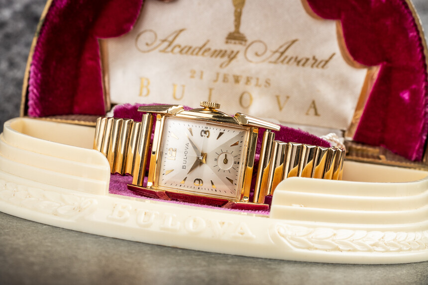 Aus New York erreichte uns zudem ein weiteres bedeutendes Modell, konkret die Bulova Academy Award. Und schon die Box verrät, dass es sich um etwas Exklusives handelt. Bulova erwarb nämlich Anfang der 50er Jahre eine spezielle Lizenz der Academy of Motion Picture Arts and Sciences. Dadurch durfte Bulova vier Jahre lang exklusiv Uhren mit der Bezeichnung Academy Award fertigen, deren Designelemente auf die berühmte Preisverleihung anspielten. Uhren mit dieser Bezeichnung stellten den gestalterischen Gipfel und die damalige Spitzenklasse des Angebots dar.