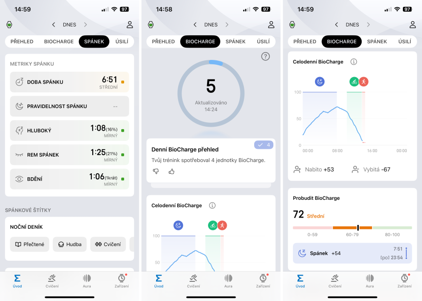 Erwähnenswert ist BioCharge, das die Energie eures Körpers einfach abbildet. Schlechter Schlaf, hoher Stress oder hohe Trainingsbelastung? Der Wert kann fallen. Und umgekehrt. Natürlich zählt am Ende immer das eigene Gefühl, aber wenn BioCharge niedrig ist und ihr euch ebenfalls nicht gut fühlt, ist es sinnvoll, darauf zu achten. Es dient im Grunde als Indikator für die Bereitschaft.