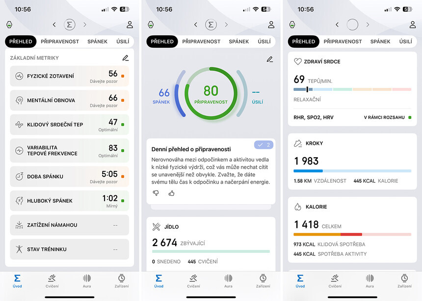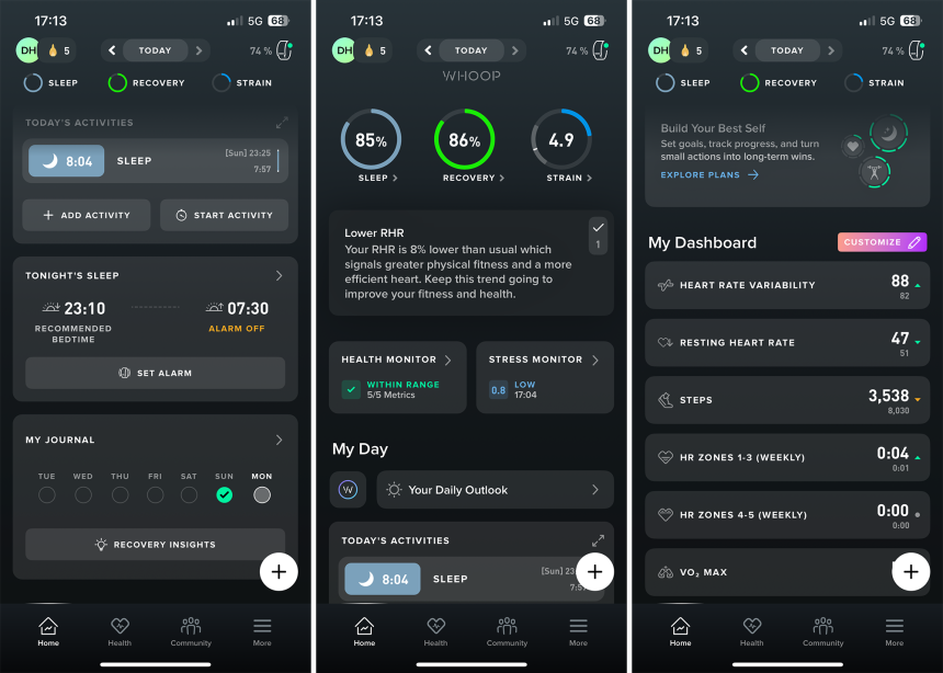 Mit „beobachten“ meine ich das 24/7-Gesundheitsmonitoring (Herzfrequenz, HRV, Atemfrequenz), Schlafanalyse, Empfehlungen zur Tagesbelastung usw.