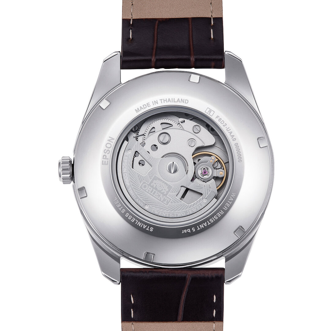 Mechanisch mit automatischem Aufzug. Orient F6D22, Gangreserve 40h, 21.600 BPH (3Hz), 22 Steine, Hacking, Möglichkeit des Handaufzugs
