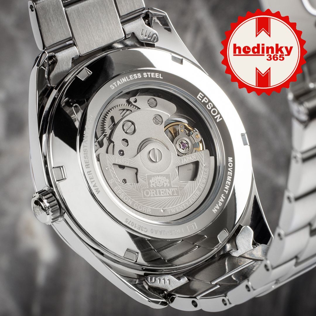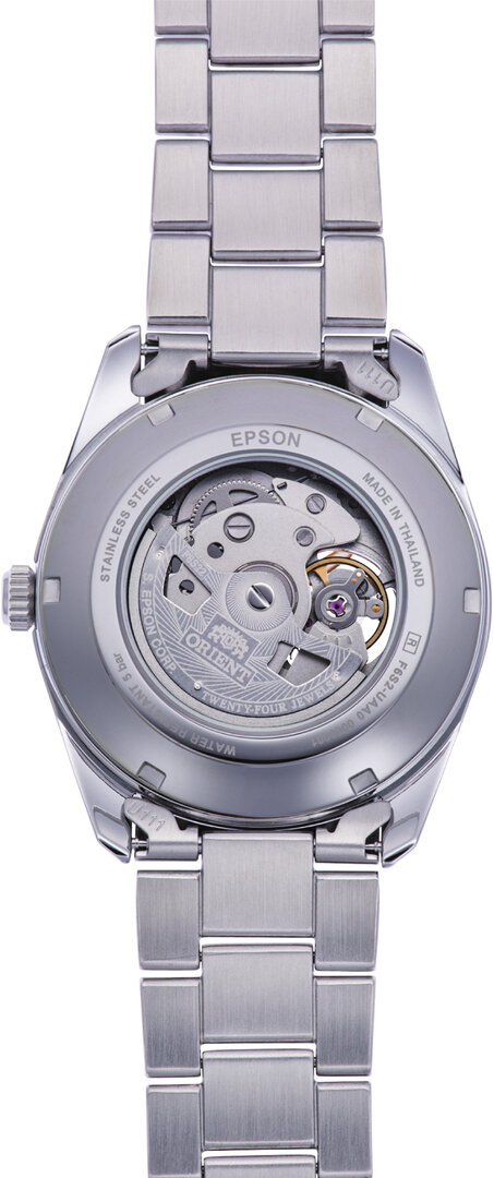 Mechanisch mit automatischem Aufzug. Orient F6S22, Gangreserve 40h, 21.600 BPH (3Hz), 24 Steine
