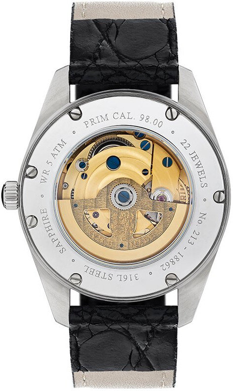 Mechanisch mit automatischem Aufzug. PRIM Kalibr 98.00, Gangreserve 48h, 21.600 BPH (3Hz), 22 Steine