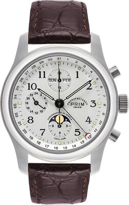 Mechanisch mit automatischem Aufzug. PRIM Kalibr 77.51 gebaut auf ETA/Valjoux 7751 gebaut auf ETA/Valjoux 7750, Gangreserve 48h, 28.800 BPH (4Hz), 25 Steine